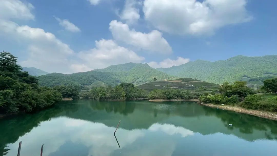 碧藍(lán)的庫(kù)水加上漫山的龍井茶,視野非常開闊。小伙伴們沿著水庫(kù)邊的臺(tái)階,拾級(jí)而上,體會(huì)碧藍(lán)的庫(kù)水和被茶山包圍的感覺。