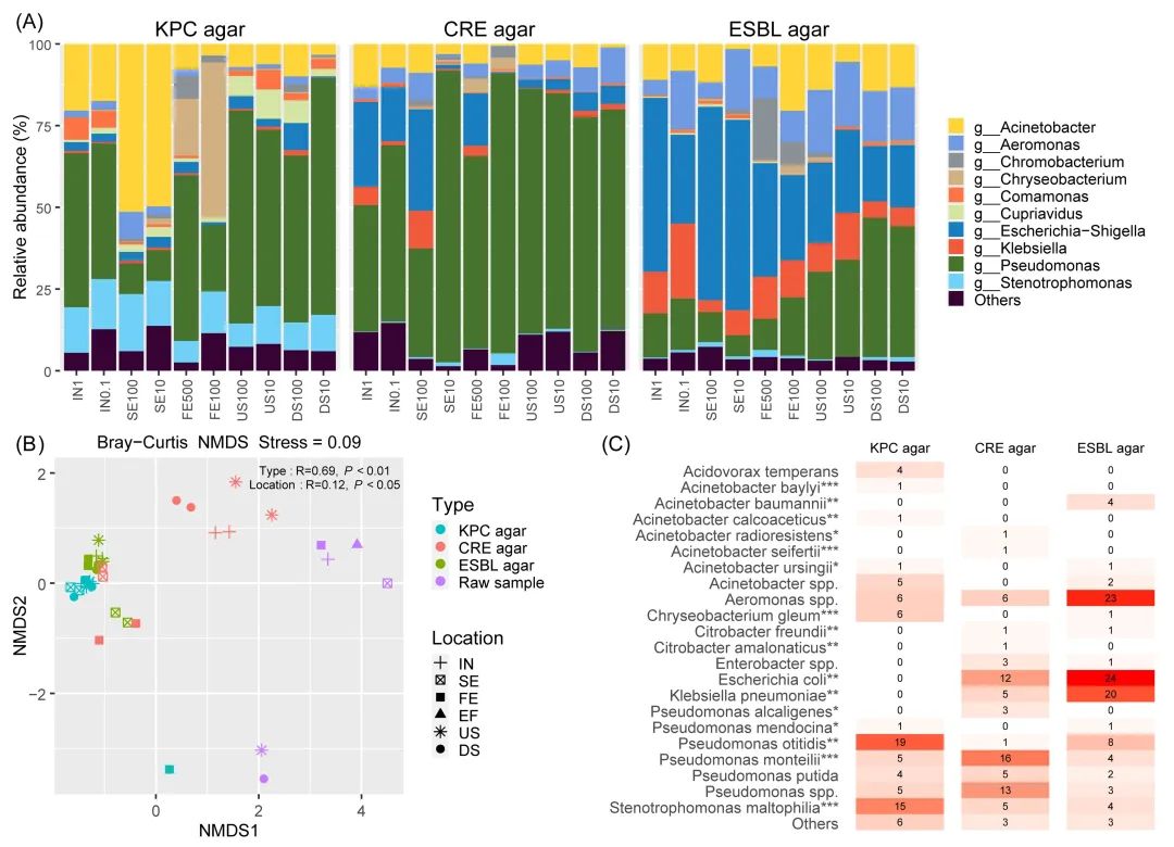 研究結(jié)果表明,基于含有抗生素培養(yǎng)基平板的表型篩選極大降低了環(huán)境微生物組的復(fù)雜度與多樣性,可以有效實(shí)現(xiàn)低豐度靶標(biāo)細(xì)菌(包括肺炎克雷伯菌、鮑曼不動(dòng)桿菌和大腸桿菌等臨床病原菌)的選擇性富集(圖2)。