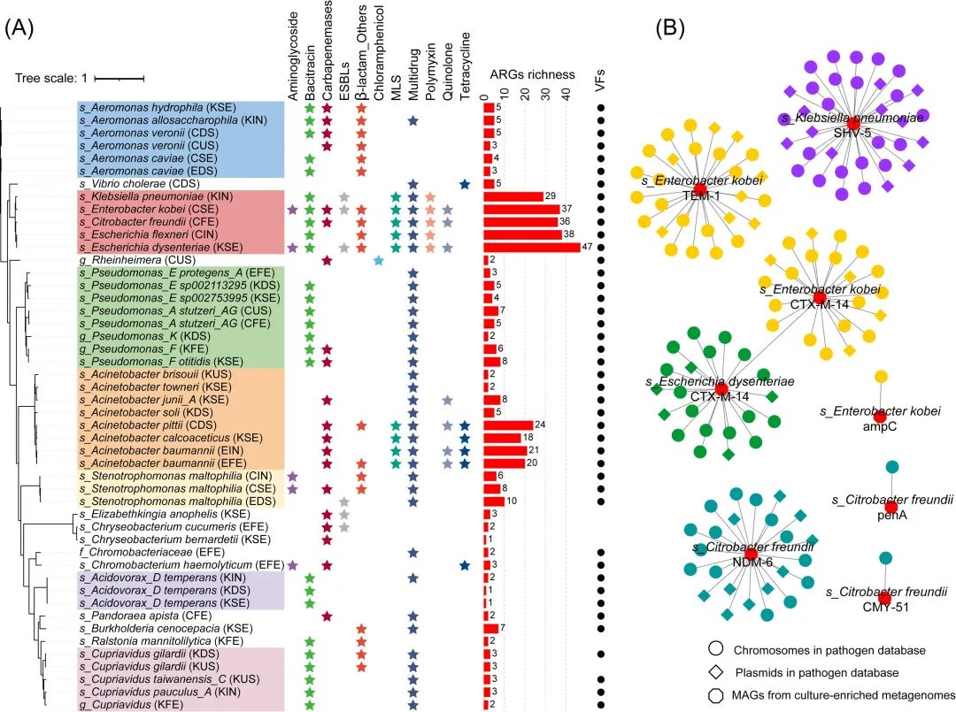 圖4. 項(xiàng)目組從某城市污水廠檢出具有超廣譜抗生素耐藥表型的48個(gè)高質(zhì)量耐藥細(xì)菌基因組的系統(tǒng)發(fā)育關(guān)系和耐藥圖譜(A),以及其與已知臨床致病細(xì)菌之間大量共享完全相同超廣譜抗生素耐藥基因(B)。