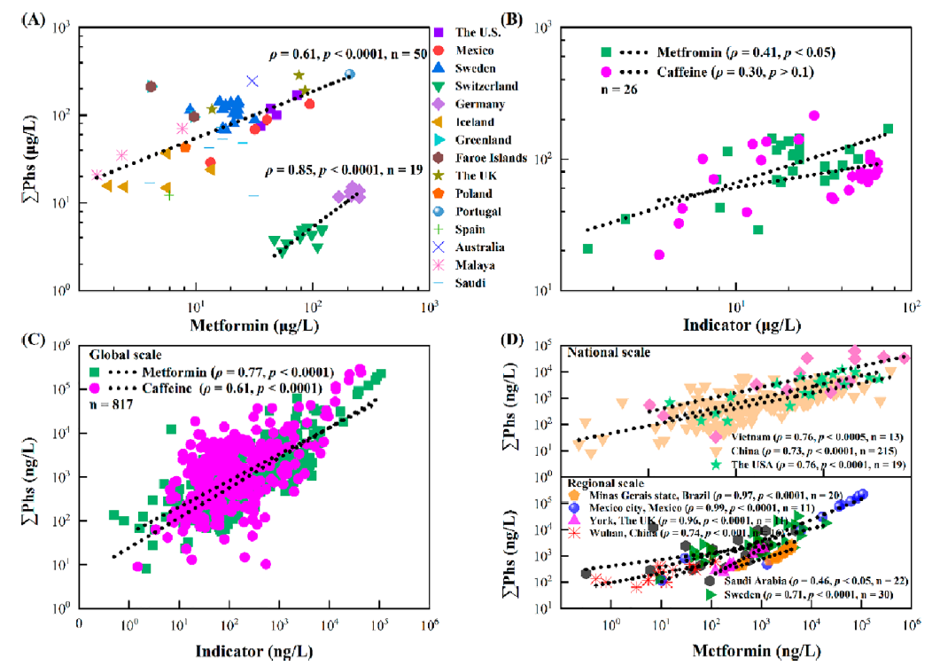 圖3. 二甲雙胍或咖啡因與污水廠進(jìn)水(A和B)和地表水(C和D)中剩余藥物濃度總和(∑Phs)的相關(guān)性分析。統(tǒng)計(jì)分析的樣品數(shù)量:進(jìn)水69個(gè)、污水廠出水38個(gè)、雨水50個(gè)、地表水817個(gè)。