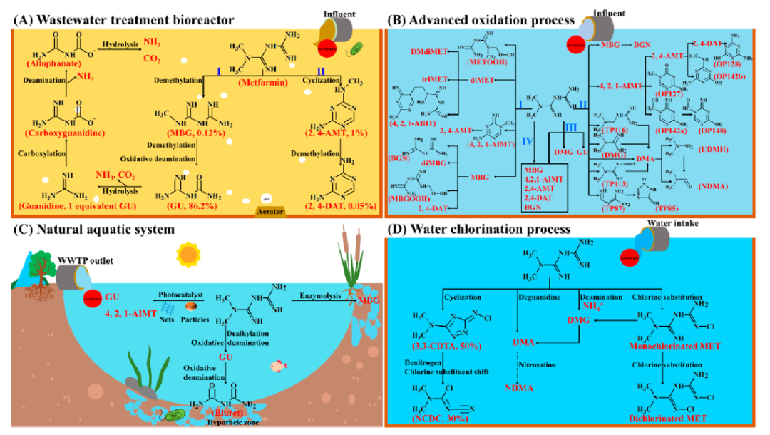 圖2. 二甲雙胍在污水生物反應(yīng)器(A)、高級氧化過程(B)、自然水體(C)和氯化消毒過程(D)中的降解轉(zhuǎn)化和產(chǎn)物形成過程。