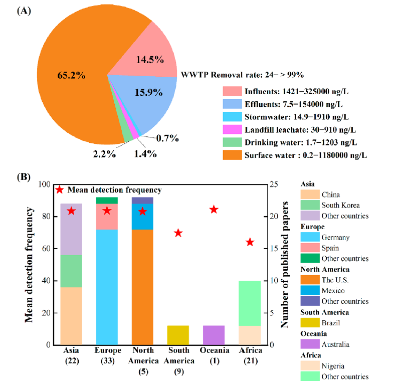 圖1. 全球水系統(tǒng)中二甲雙胍的賦存:(A)各種水系統(tǒng)中檢出二甲雙胍的比例及濃度范圍;(B)各大洲檢出二甲雙胍的文章數(shù)量及在水環(huán)境中的平均檢出頻率,括號內(nèi)數(shù)字代表在各大洲檢出二甲雙胍的國家數(shù)量。