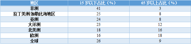 表2 | 2020年15歲以下和65歲以上人口占比(按大陸劃分)
