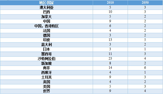 這個比率可以作為一個粗略的指標(biāo),說明每個潛在的老年受撫養(yǎng)人的潛在撫養(yǎng)人的數(shù)量(包括醫(yī)療費(fèi)用)。在1950年,世界上每一個老年人口就有12個工作年齡人口。但到2010年,這個比例下降到9,最大的下降發(fā)生在較發(fā)達(dá)的國家。然而,中國和其他金磚四國經(jīng)濟(jì)體預(yù)計在2050年的老年人贍養(yǎng)率將接近或低于法國和美國等發(fā)達(dá)國家,這主要是因為這些發(fā)達(dá)國家具有穩(wěn)定的生育率和移民數(shù)量,可以將過去幾十年來下降的比率穩(wěn)定住。
